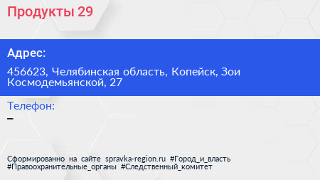 Продукты 29 по адресу 456623, Челябинская область, Копейск, Зои Космодемьянской, 27 в дальнейшем Организация, размещена в следующих категориях: