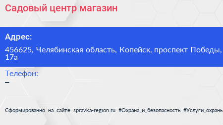 Садовый центр, магазин по адресу 456625, Челябинская область, Копейск, проспект Победы, 17а в дальнейшем Организация, размещена в следующих категориях: