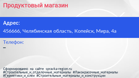 Продуктовый магазин по адресу 456666, Челябинская область, Копейск, Мира, 4а в дальнейшем Организация, размещена в следующих категориях: