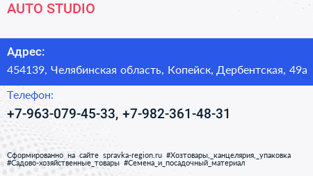 AUTO STUDIO по адресу 454139, Челябинская область, Копейск, Дербентская, 49а в дальнейшем Организация, размещена в следующих категориях: