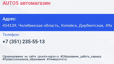 AUTO5, автомагазин по адресу 454139, Челябинская область, Копейск, Дербентская, 49а в дальнейшем Организация, размещена в следующих категориях: