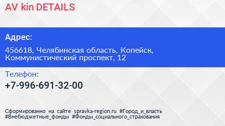 AV-kin DETAILS по адресу 456618, Челябинская область, Копейск, Коммунистический проспект, 12 в дальнейшем Организация, размещена в следующих категориях: