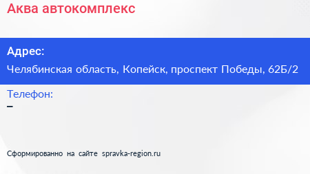 Аква, автокомплекс по адресу Челябинская область, Копейск, проспект Победы, 62Б/2 в дальнейшем Организация, размещена в следующих категориях: