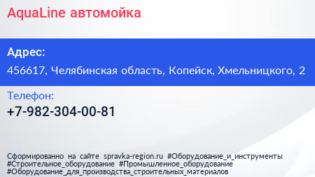 AquaLine, автомойка по адресу 456617, Челябинская область, Копейск, Хмельницкого, 2 в дальнейшем Организация, размещена в следующих категориях: