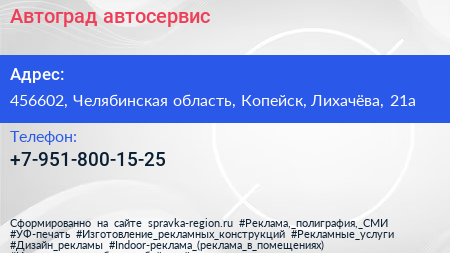 Автоград, автосервис по адресу 456602, Челябинская область, Копейск, Лихачёва, 21а в дальнейшем Организация, размещена в следующих категориях: