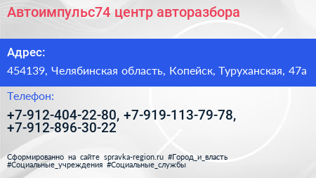 Автоимпульс74, центр авторазбора по адресу 454139, Челябинская область, Копейск, Туруханская, 47а в дальнейшем Организация, размещена в следующих категориях: