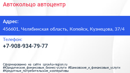 Автокольцо, автоцентр по адресу 456601, Челябинская область, Копейск, Кузнецова, 37/4 в дальнейшем Организация, размещена в следующих категориях: