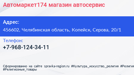Автомаркет174, магазин-автосервис по адресу 456602, Челябинская область, Копейск, Серова, 20/1 в дальнейшем Организация, размещена в следующих категориях: