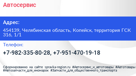 Автосервис по адресу 454139, Челябинская область, Копейск, территория ГСК 316, 1/1 в дальнейшем Организация, размещена в следующих категориях: