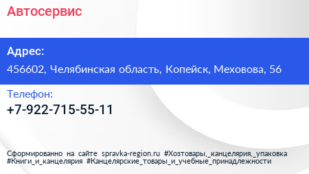Автосервис по адресу 456602, Челябинская область, Копейск, Меховова, 56 в дальнейшем Организация, размещена в следующих категориях: