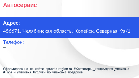 Автосервис по адресу 456671, Челябинская область, Копейск, Северная, 9а/1 в дальнейшем Организация, размещена в следующих категориях:
