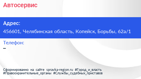 Автосервис по адресу 456601, Челябинская область, Копейск, Борьбы, 62а/1 в дальнейшем Организация, размещена в следующих категориях: