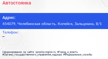 Автостоянка по адресу 454079, Челябинская область, Копейск, Зальцмана, 8/1 в дальнейшем Организация, размещена в следующих категориях: