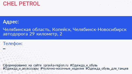 CHEL PETROL по адресу Челябинская область, Копейск, Челябинск-Новосибирск автодорога 29 километр, 2 в дальнейшем Организация, размещена в следующих категориях: