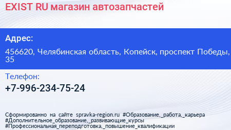 EXIST.RU, магазин автозапчастей по адресу 456620, Челябинская область, Копейск, проспект Победы, 35 в дальнейшем Организация, размещена в следующих категориях: