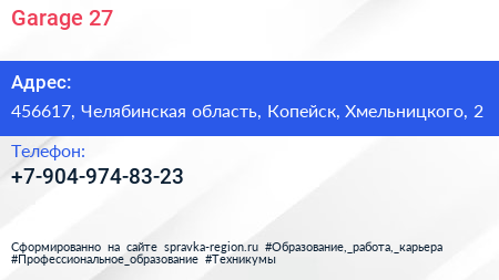 Garage 27 по адресу 456617, Челябинская область, Копейск, Хмельницкого, 2 в дальнейшем Организация, размещена в следующих категориях: