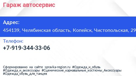 Гараж, автосервис по адресу 454139, Челябинская область, Копейск, Чистопольская, 29 в дальнейшем Организация, размещена в следующих категориях: