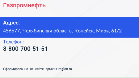 Газпромнефть по адресу 456677, Челябинская область, Копейск, Мира, 61/2 в дальнейшем Организация, размещена в следующих категориях:
