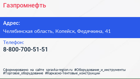 Газпромнефть по адресу Челябинская область, Копейск, Федячкина, 41 в дальнейшем Организация, размещена в следующих категориях:
