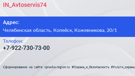 IN_Avtoservis74 по адресу Челябинская область, Копейск, Кожевникова, 20/1 в дальнейшем Организация, размещена в следующих категориях: