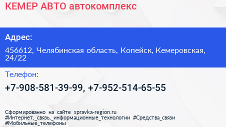 КЕМЕР-АВТО, автокомплекс по адресу 456612, Челябинская область, Копейск, Кемеровская, 24/22 в дальнейшем Организация, размещена в следующих категориях: