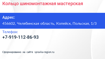 Кольцо, шиномонтажная мастерская по адресу 456602, Челябинская область, Копейск, Польская, 1/3 в дальнейшем Организация, размещена в следующих категориях:
