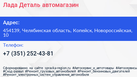 Лада-Деталь, автомагазин по адресу 454139, Челябинская область, Копейск, Новороссийская, 10 в дальнейшем Организация, размещена в следующих категориях: