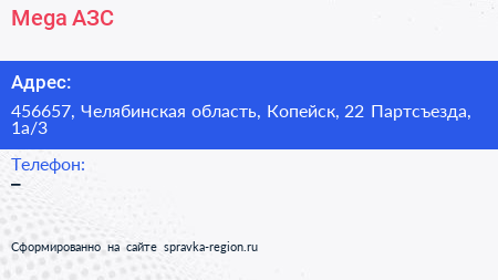 Mega, АЗС по адресу 456657, Челябинская область, Копейск, 22 Партсъезда, 1а/3 в дальнейшем Организация, размещена в следующих категориях: