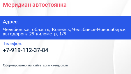 Меридиан, автостоянка по адресу Челябинская область, Копейск, Челябинск-Новосибирск автодорога 29 километр, 1/9 в дальнейшем Организация, размещена в следующих категориях: