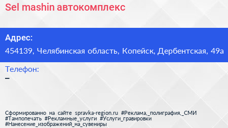 Sel`mashin, автокомплекс по адресу 454139, Челябинская область, Копейск, Дербентская, 49а в дальнейшем Организация, размещена в следующих категориях: