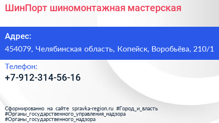 ШинПорт, шиномонтажная мастерская по адресу 454079, Челябинская область, Копейск, Воробьёва, 210/1 в дальнейшем Организация, размещена в следующих категориях: