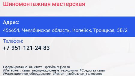 Шиномонтажная мастерская по адресу 456654, Челябинская область, Копейск, Троицкая, 5Б/2 в дальнейшем Организация, размещена в следующих категориях: