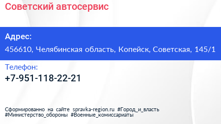 Советский, автосервис по адресу 456610, Челябинская область, Копейск, Советская, 145/1 в дальнейшем Организация, размещена в следующих категориях: