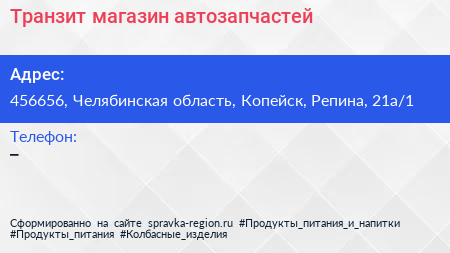 Транзит, магазин автозапчастей по адресу 456656, Челябинская область, Копейск, Репина, 21а/1 в дальнейшем Организация, размещена в следующих категориях:
