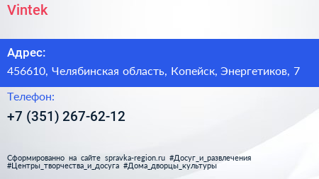 Vintek по адресу 456610, Челябинская область, Копейск, Энергетиков, 7 в дальнейшем Организация, размещена в следующих категориях:
