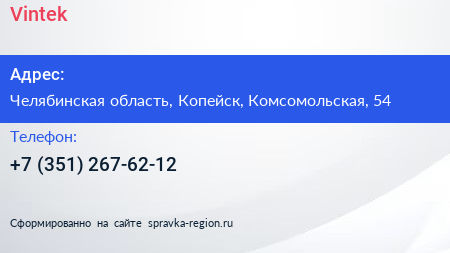 Vintek по адресу Челябинская область, Копейск, Комсомольская, 54 в дальнейшем Организация, размещена в следующих категориях: