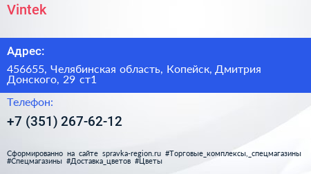 Vintek по адресу 456655, Челябинская область, Копейск, Дмитрия Донского, 29 ст1 в дальнейшем Организация, размещена в следующих категориях: