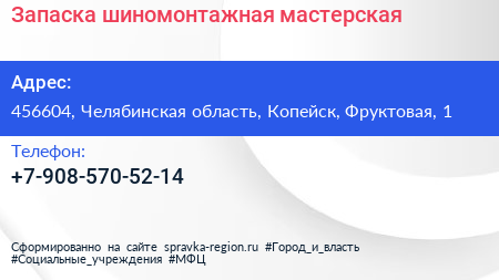 Запаска, шиномонтажная мастерская по адресу 456604, Челябинская область, Копейск, Фруктовая, 1 в дальнейшем Организация, размещена в следующих категориях: