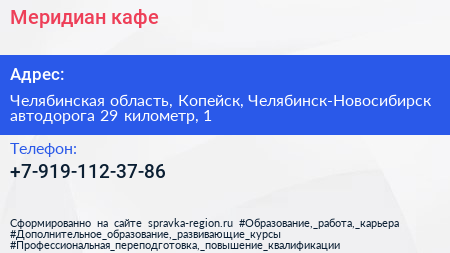 Меридиан, кафе по адресу Челябинская область, Копейск, Челябинск-Новосибирск автодорога 29 километр, 1 в дальнейшем Организация, размещена в следующих категориях: