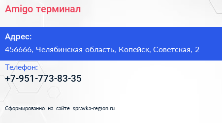 Amigo, терминал по адресу 456666, Челябинская область, Копейск, Советская, 2 в дальнейшем Организация, размещена в следующих категориях: