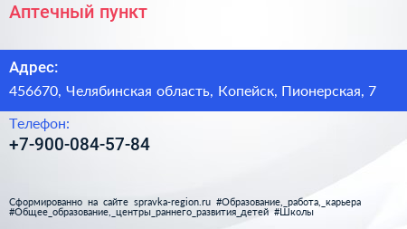 Аптечный пункт по адресу 456670, Челябинская область, Копейск, Пионерская, 7 в дальнейшем Организация, размещена в следующих категориях: