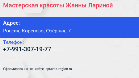Мастерская красоты Жанны Лариной по адресу 7, Озёрная улица, Жилой комплекс «Люберцы 2018», Зенино, Люберцы, городской округ Люберцы, Московская область, Центральный федеральный округ, 140016, Россия в дальнейшем Организация, размещена в следующих категориях: