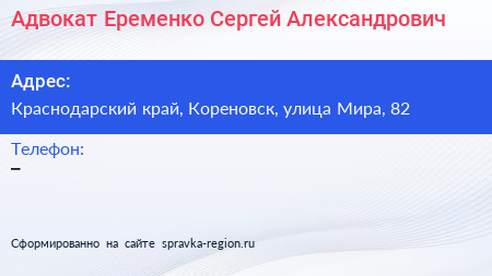 Адвокат Еременко Сергей Александрович по адресу Краснодарский край, Кореновск, улица Мира, 82 в дальнейшем Организация, размещена в следующих категориях: