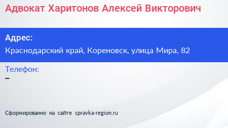 Адвокат Харитонов Алексей Викторович по адресу Краснодарский край, Кореновск, улица Мира, 82 в дальнейшем Организация, размещена в следующих категориях: