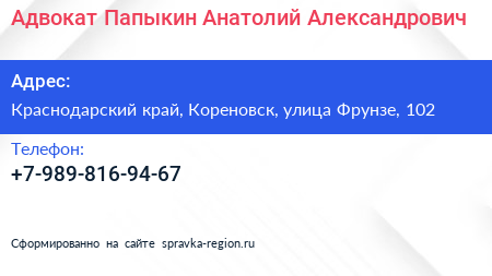 Адвокат Папыкин Анатолий Александрович по адресу Краснодарский край, Кореновск, улица Фрунзе, 102 в дальнейшем Организация, размещена в следующих категориях: