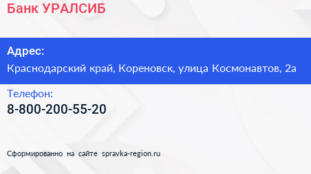 Банк УРАЛСИБ по адресу Краснодарский край, Кореновск, улица Космонавтов, 2а в дальнейшем Организация, размещена в следующих категориях: