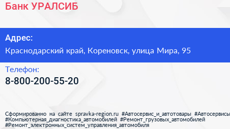 Банк УРАЛСИБ по адресу Краснодарский край, Кореновск, улица Мира, 95 в дальнейшем Организация, размещена в следующих категориях: