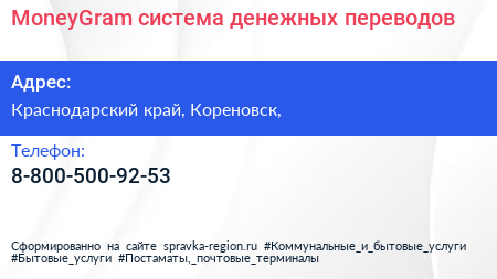MoneyGram, система денежных переводов по адресу Краснодарский край, Кореновск, в дальнейшем Организация, размещена в следующих категориях:
