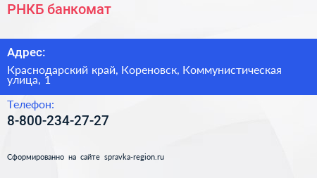 РНКБ, банкомат по адресу Краснодарский край, Кореновск, Коммунистическая улица, 1 в дальнейшем Организация, размещена в следующих категориях: