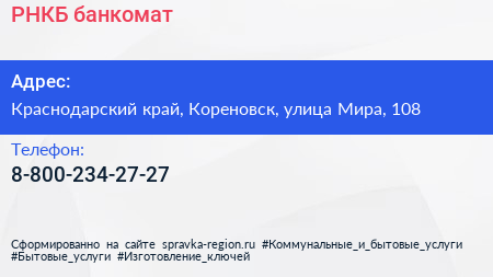 РНКБ, банкомат по адресу Краснодарский край, Кореновск, улица Мира, 108 в дальнейшем Организация, размещена в следующих категориях: